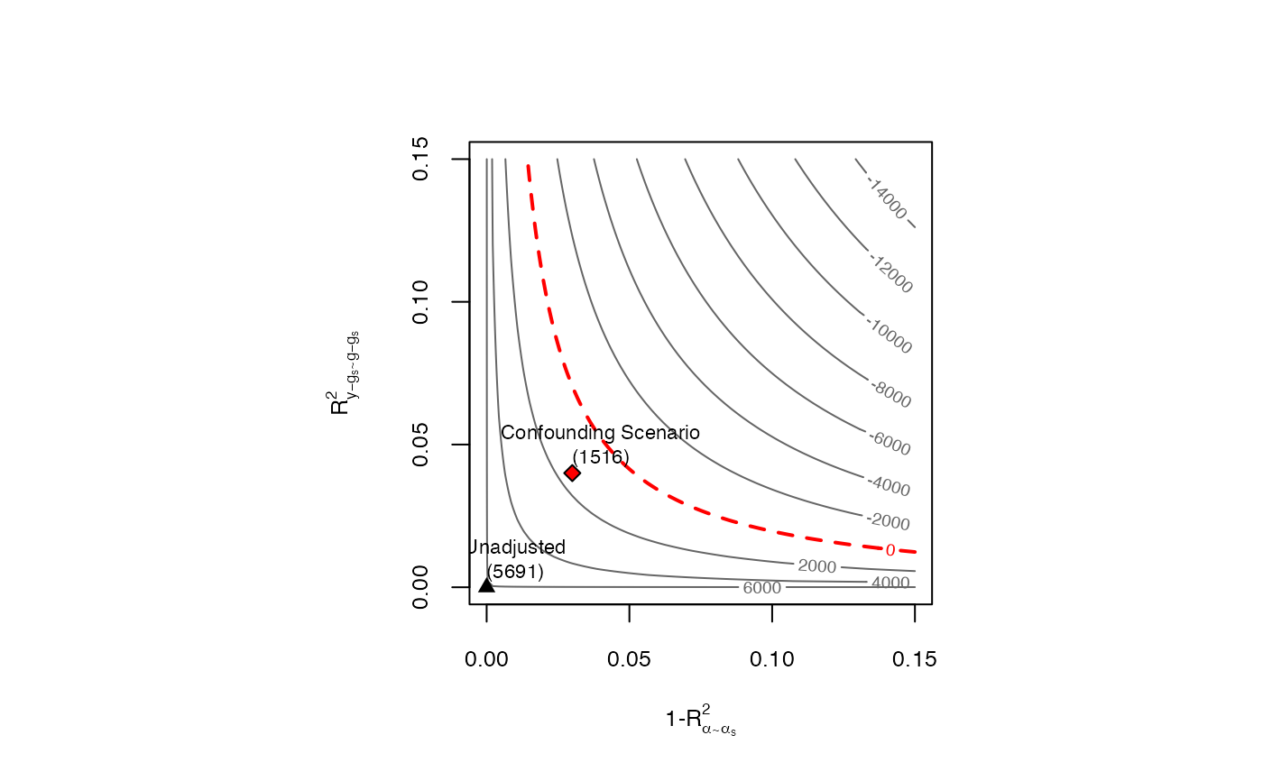 #> -- Robustness Value for the Confidence Bound (RVa): omitted variables that explain more than RV% of the residual variation of the outcome (cf.y) and generate an additional RV% of variation on the Riesz Representer (cf.d) are sufficiently strong to make the confidence bounds include 0, at the significance level of alpha = 0.05. Conversely, omitted variables that do not explain more than RV% of the residual variation of the outcome nor generate an additional RV% of variation on the Riesz Representer are not sufficiently strong to do so.