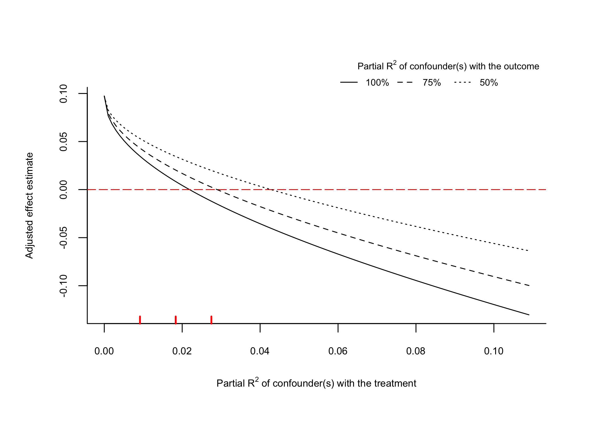 #> -- Robustness Value, q = 1: unobserved confounders (orthogonal to the covariates) that explain more than 13.88% of the residual variance of both the treatment and the outcome are strong enough to bring the point estimate to 0 (a bias of 100% of the original estimate). Conversely, unobserved confounders that do not explain more than 13.88% of the residual variance of both the treatment and the outcome are not strong enough to bring the point estimate to 0.
