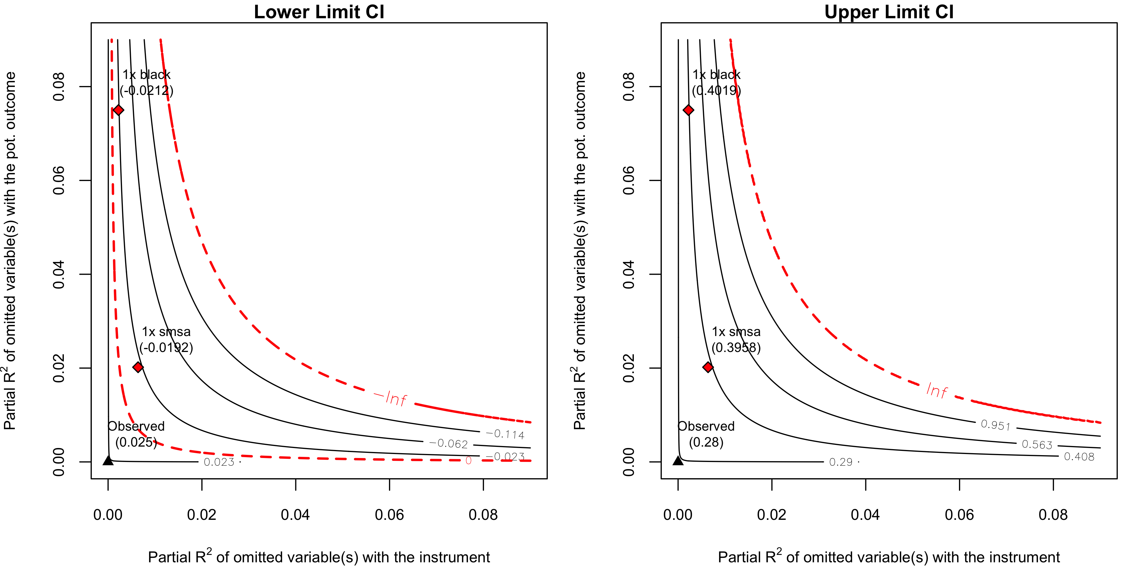 | Note: df = 2994; Bound ( 1x black ): R2Z~W|X = 0.2%, R2Y(0)~W|Z,X = 7.5% | ||||||