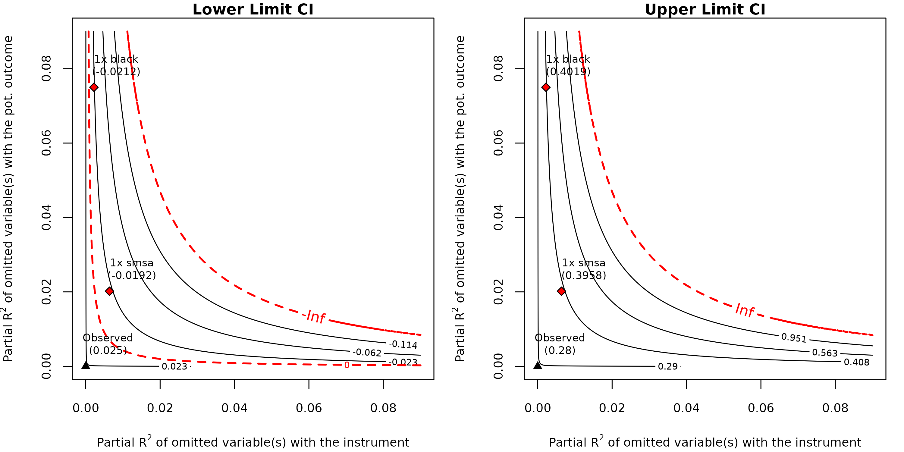The extreme robustness value (XRV) describes the minimum strength of association that omitted variables need to have with the instrument alone in order to be problematic. The XRV of 0.05% means that, if we are not willing to impose constraints on the partial of omitted variables with the outcome, then such omitted variables need only explain 0.05% of the residual variation of the instrument to be problematic. This is a worst-case measure: it considers the scenario in which confounders may explain an arbitrarily large share of the outcome’s residual variation, and asks how much of the instrument’s variation they would still need to explain.
