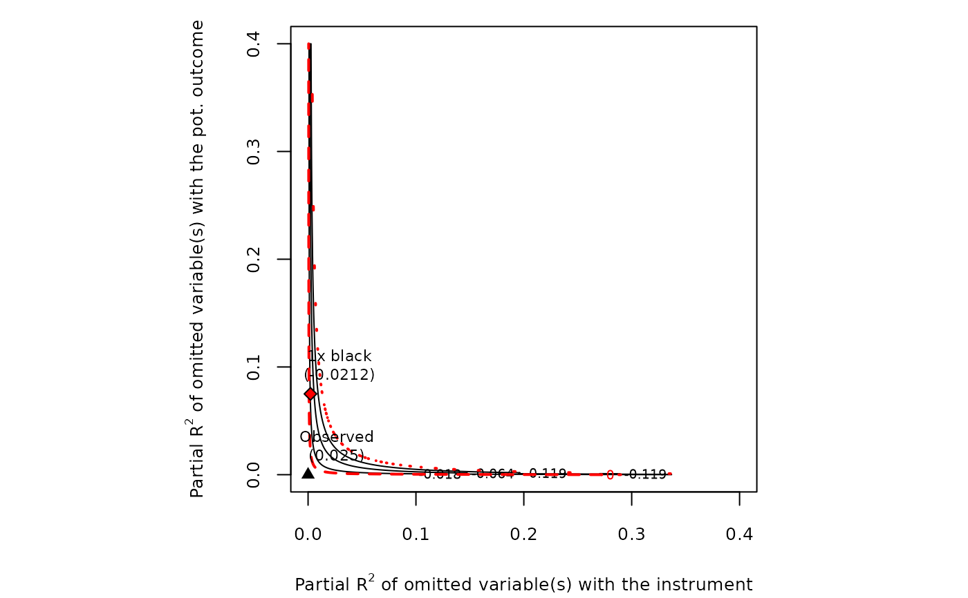 If parm = "iv" (default) contour plots of the IV estimate are shown. The horizontal axis of the plot shows hypothetical values of the partial R2 of latent variables with the instrument. The vertical axis shows hypothetical values of the partial R2 of latent variables with the (pot.) outcome. The contour levels represent the adjusted lower limit (or upper limit) of the Anderson-Rubin confidence interval of the IV estimate, or the t-value for testing a specific null hypothesis. The reference points are the bounds on the partial R2 of latent variables if they were k times "as strong" as the observed covariate used for benchmarking (see arguments kz and ky). The dotted red line show the chosen critical threshold (for instance, zero): latent variables with such strength (or stronger) are sufficient to invalidate the research conclusions.