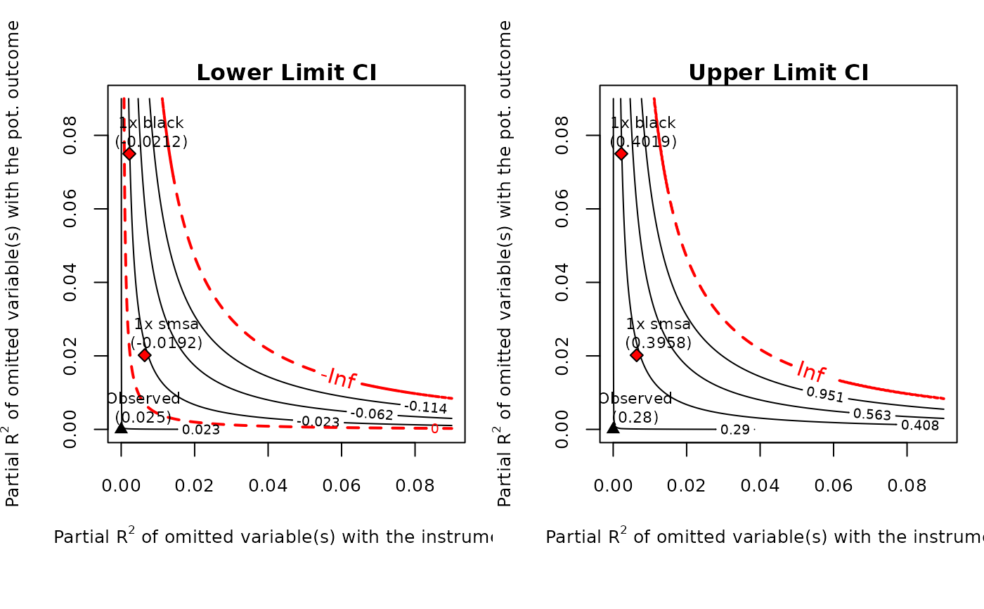 card.sens <- sensemakr(card.fit, benchmark_covariates = c("black", "smsa"))
